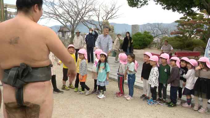 武蔵川部屋は、朝稽古を一般公開しています。この日は、地元のファンに加えて近くの幼稚園と保育園の園児も見学に訪れていました。力士たちがぶつかり合う迫力ある稽古に子供たちも夢中です。稽古のあとには見学に来た人たちが力士とふれあう時間も設けられていました。