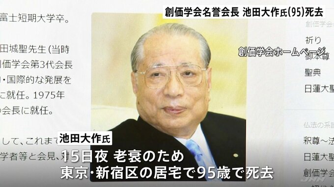創価学会の池田大作名誉会長が亡くなったことが分かりました。95歳でした。創価学会によりますと、池田大作氏は15日夜、老衰のため、東京・新宿区の居宅で亡くなりました。95歳でした。池田氏は1928年生まれ、東京…