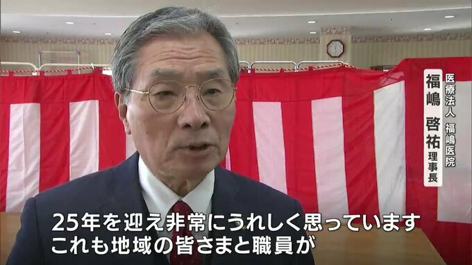 (医療法人 福嶋医院 福嶋啓祐理事長)「25年を迎えて非常にうれしく思っています。これもひとえに地域の皆さまと職員が一生懸命がんばってくれたおかげだと思って感謝しております」