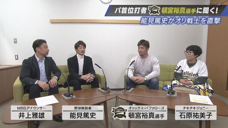 MBS井上雅雄アナウンサー:頓宮選手にいろいろと伺っていきたいのですが、まず、能見さん、首位打者獲得です。