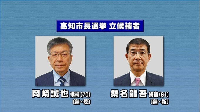 高知市長選挙に立候補したのは届け出順に、現職で6期目を目指す岡﨑誠也(おかざき・せいや)(70)候補と【立憲民主、国民民主、社民党・新社会党推薦】、新人で元県議会議員の桑名龍吾(くわな・りゅうご)(61)候補の【自民・公明推薦】のいずれも無所属の2人です。