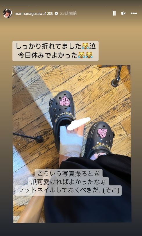 さらに長澤さんは、18日の投稿で「ご報告遅くなりましたが折れてました」「小指のくせに全治2ヶ月!!!泣」と小指が折れていたこと、また、治療に2か月かかることを報告しました。