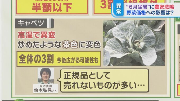 キャベツも、高温により全体の3割が炒めたような茶色に変わってしまったということです。今後広がる可能性もあり、