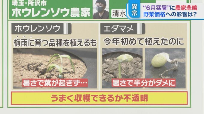 埼玉県所沢市ホウレンソウ農家の清水翔一さんは、梅雨に育つほうれん草品種を植えましたが、暑さで葉が起きないまま梅雨明けに。今年初めて植えた枝豆も、暑さで半分が駄目に。