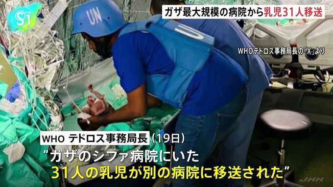 戦闘が続くパレスチナ自治区ガザで、医療機能がほぼ停止している最大規模の病院から乳児31人が移送されました。今後、エジプトに移される予定だということです。WHO=世界保健機関のテドロス事務局長は19日、“ガザ…