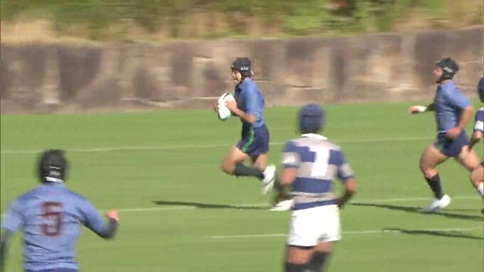 前半7分、倉敷のゲームキャプテン・松岡からパスを受けた14番宮崎が一気に抜け出しトライ。