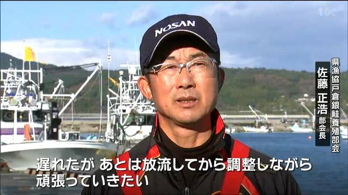 養殖ギンザケ発祥の地、宮城県南三陸町の志津川湾で来年春の水揚げに向けた稚魚の放流が始まりました。