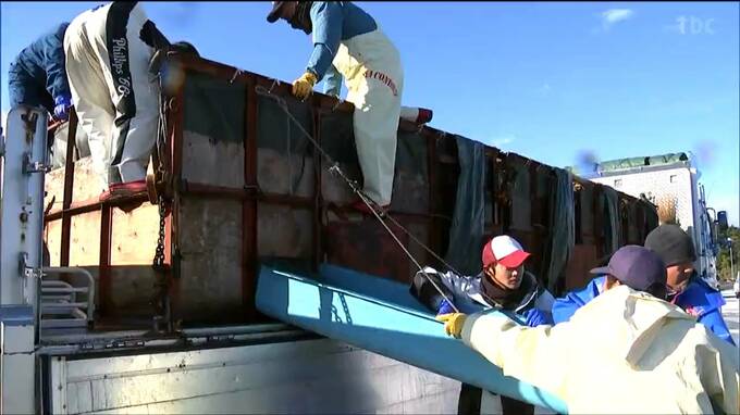 南三陸町戸倉地区の波伝谷漁港です。川崎町の養魚場から運ばれてきた体長20センチほどのギンザケの稚魚9トン、およそ5万7000匹が船へと移されました。