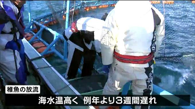 その後、船は3キロほど沖合のいけすへと向かい稚魚を次々と放流していきました。今年は、海水温が高い状態が続きいけすへの放流は例年に比べ3週間ほど遅いスタートとなりました。放流は12月上旬まで行われる予定です。
