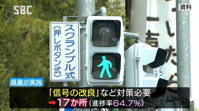 県警が行う「信号の改良」などが必要な場所は17か所で、年度末までに対策が施された進捗率は64.7%、また国や市町村が行う「歩道整備」や「車止めポスト」の設置などが必要な場所は191か所で、進捗状況は45.5%でした。