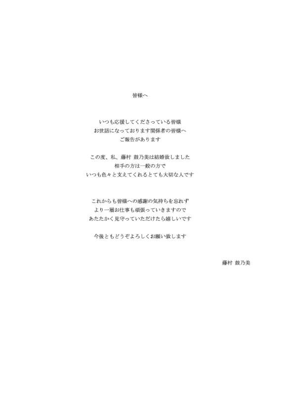 藤村さんは、「いつも応援して下さっている 大切な皆様へ」とつづって、結婚報告の書面を投稿。投稿には、「この度、私、藤村 鼓乃美は結婚致しました 相手の方は一般の方で いつも色々と支えてくれるとても大切な人です」と報告しました。