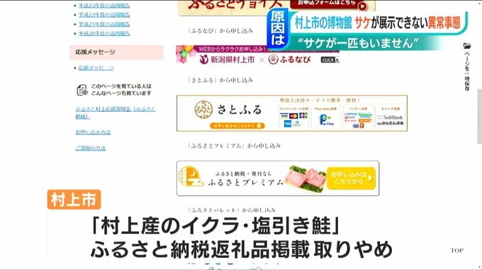 村上市によりますと、ふるさと納税の返礼品になっている村上産のイクラや塩引き鮭はサケが獲れないため当面、掲載を取りやめているそうです。