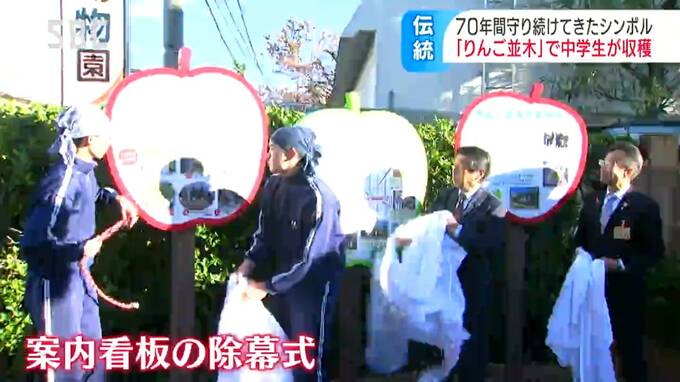 この日は収穫に合わせて、「りんご並木」の歴史や活動などを伝える案内看板の除幕式も行われました。