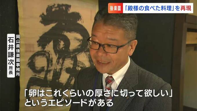 (岡山県後楽園事務所 石井謙次所長)「例えば、卵はこれくらいの厚さに切って欲しいとかというエピソードがあるわけですね。そうした歴史的事実があって料理も再現された。後楽園の歴史にも思いをはせていただきたいと思いますね」