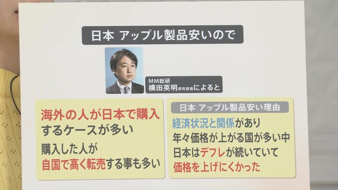 iPhoneは、海外の人が日本で購入するケースが多い。自国に戻ってそれを転売する。そうすると利益が出るということで、購入した人が自国で高く転売することも多い。Appleとしてはブランドイメージを損なうので良く思っていないという分析がある。
