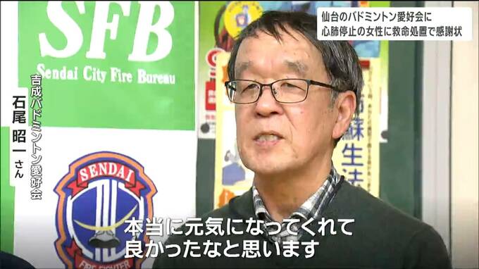 今年9月、バドミントンの試合直後に心肺停止になった女性を迅速な救命処置で助けたとして仙台市のバドミントン愛好会に感謝状が贈られました。