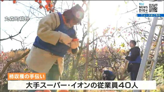 丸森町耕野の畑で柿の収穫を手伝ったのは、大手スーパー・イオンの従業員40人です。