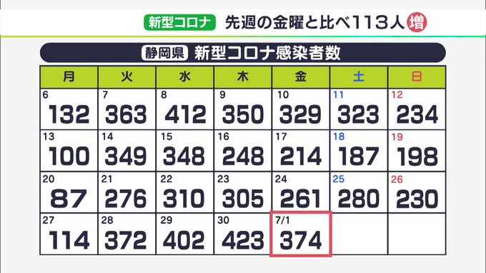 7月1日、静岡県内で新たに374人が新型コロナウイルスに感染したことがわかりました。新たな感染者を自治体別にみますと、浜松市で91人、静岡市で72人、磐田市で25人などとなっています。死亡した人や新たなクラス…