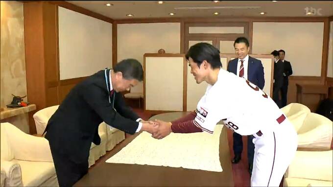 県庁を訪れたのは、楽天イーグルスの指揮を執る今江敏晃監督と楽天野球団の森井誠之社長です。就任後、初めて村井知事に挨拶した今江監督は、来シーズンは球団創設から20周年を迎えるとして、「選手が思い切ってプレーできるよう全力を注ぐ」と優勝に向け決意を述べました。