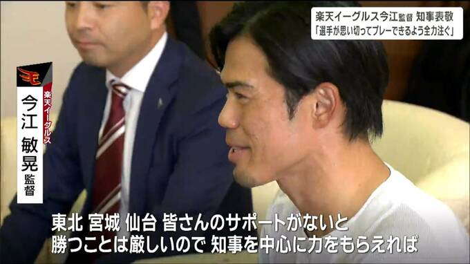 プロ野球・楽天イーグルスの今江敏晃監督が21日県庁を訪れ、村井知事に「選手が思い切ってプレーできるよう全力を注ぐ」と述べ来シーズンの優勝を誓いました。