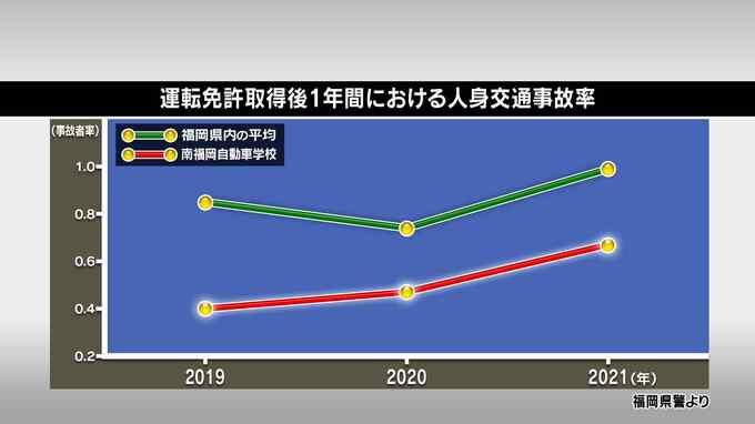 また、この指導法が事故防止にも効果があることを示すデータもあります。福岡県警の統計によりますと2019年から2021年の間にこの自動車学校で運転免許を取得した人が、免許取得後1年間に人身事故を起こした割合は、県内の平均値を大きく下回っているということです。