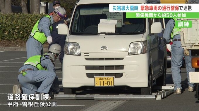訓練は甲府市内に降り続く大雪で道路に多数の車両が立往生したという想定で行われました。