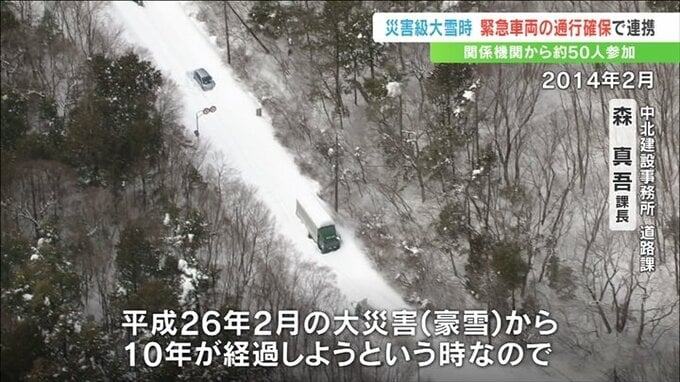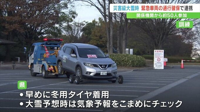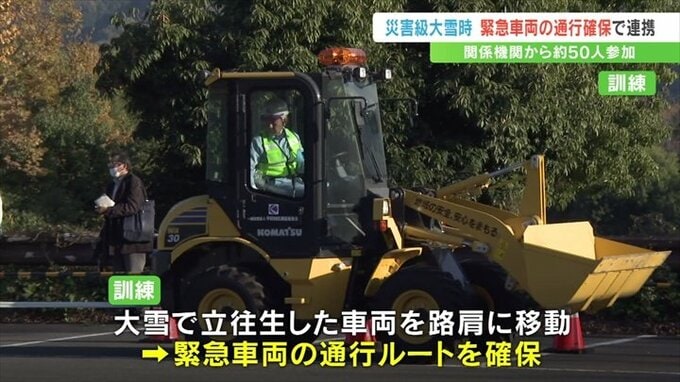 訓練には県や警察、建設業協会などの関係機関からおよそ50人が参加し、大雪で立往生した車両を小型重機で路肩に移動させ緊急車両の通行ルートを確保しました。