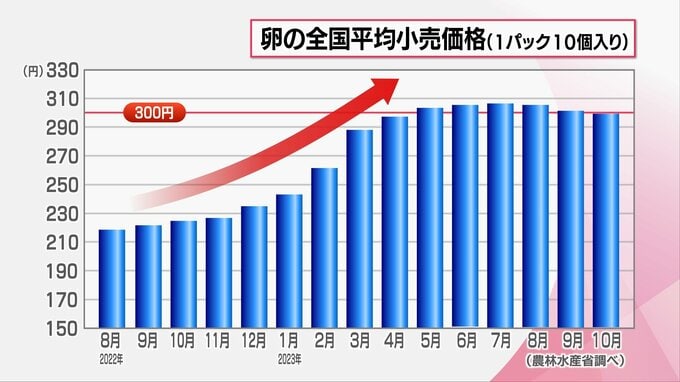 大量のニワトリが殺処分されたことで卵の生産量が減少し、卵1パックが300円台まで高騰し、現在も高値が続いています。
