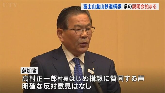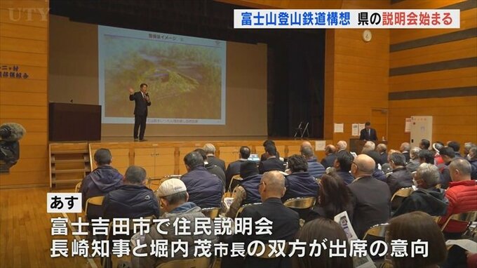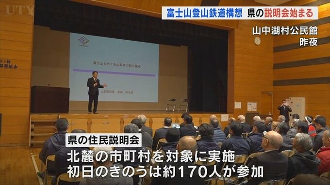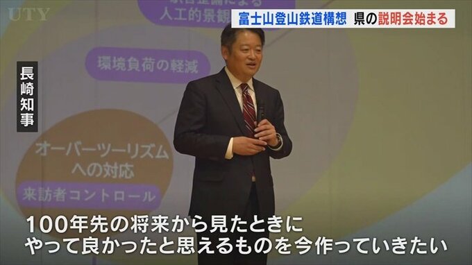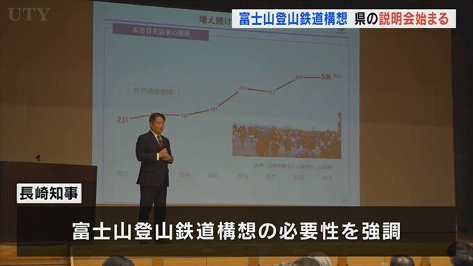 山梨県が検討を進める富士山登山鉄道構想の住民説明会が山中湖村で始まり、長崎知事自ら構想の意義を訴え理解を求めました。