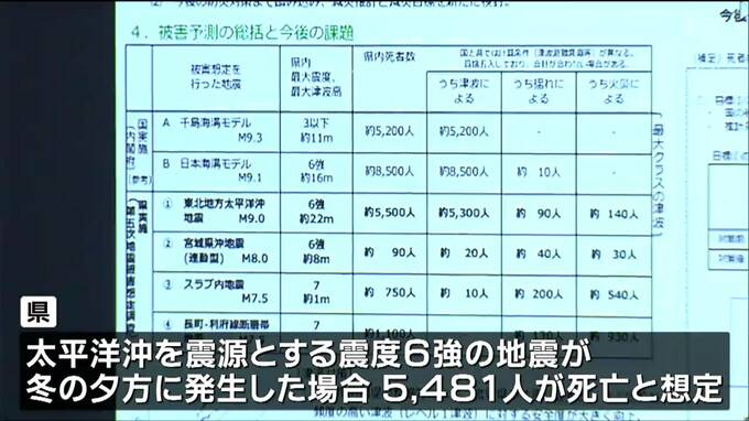 その結果、太平洋沖を震源とする震度6強の地震が冬の夕方に発生した場合、県内では5481人が死亡すると想定しました。その上で、17分以内に避難を始めることにより、死者の数を想定より8割減らす目標を設定しました。