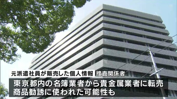 捜査関係者によりますと、元派遣社員が販売した個人情報は、東京都内の名簿業者から都内の貴金属業者に転売され、商品の勧誘に使われた可能性があるということです。