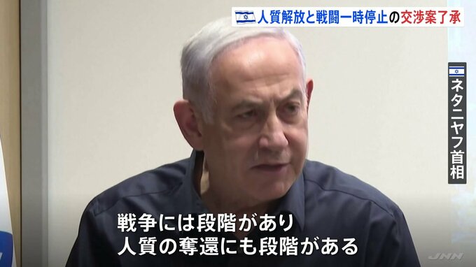 パレスチナ自治区ガザで、イスラム組織ハマスに拘束されている人質の解放と戦闘の一時停止に向けた交渉案について、イスラエル政府が開いた臨時の閣議でさきほど、了承されたことが明らかになりました。イスラエル…
