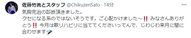 22日、Sing Like Talkingの佐藤竹善さんとスタッフがXを更新し、肺気胸から回復したことを報告しました。
