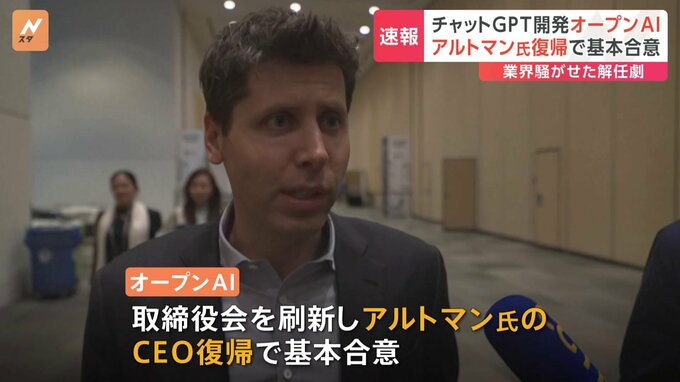 「チャットGPT」を開発したアメリカ「オープンAI」は、事実上解任したサム・アルトマン氏がCEOに復帰することで基本合意したと発表しました。アルトマン氏は、オープンAIの取締役会でCEOを事実上解任され、直後に…