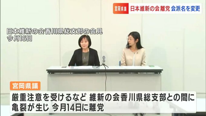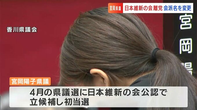 しかし宮岡氏は、収支報告書が期限内に提出されなかったとして今年6月に厳重注意を受けるなど、日本維新の会香川県総支部との間に亀裂が生じていて、今月14日に離党していました。