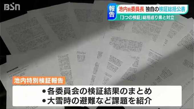 その内容を不十分だとして今回、池内前委員長が公表した報告書は101ページに及び、それぞれの委員会の検証結果のまとめに加えて、大雪の時の避難など残された課題を紹介。