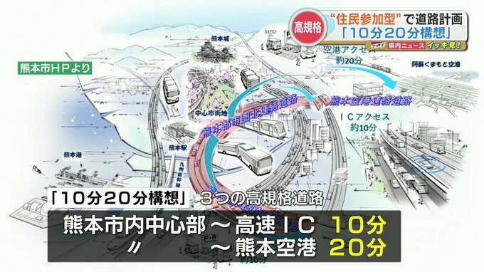 3つの高規格道路(※)で熊本市中心部から高速道路のIC(インターチェンジ)までを10分、熊本空港までを20分で結ぶ計画の「10分20分構想」。熊本県と熊本市は、これを“住民参加型”で進める方針です。熊本市 大…