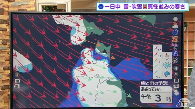 この金・土・日というのはですね雪マークがついていますから、天気が大きく崩れて、真冬並みの寒気、平地でも雪・吹雪のおそれがあります。金曜日は冬型の気圧配置が強まりまして気温急降下。横殴りの雨から横殴りの雪吹雪に変わってきます。午前中はまだ雨。山の方から雪に変わってきて金曜日の午後は広く雪で吹雪いてきます。気温の下がる夜は積雪のところも。平地でも出てきそうです。