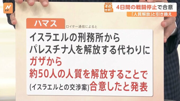 一方でハマス側は、ロイター通信によりますと、イスラエルの刑務所からパレスチナ人を解放する代わりに、ガザから約50人の人質を解放することでイスラエルとの交渉案は合意したと発表しています。