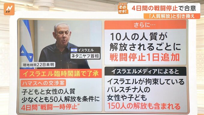 イスラエルメディアは、イスラエルが拘束しているパレスチナ人の女性や子ども150人の解放も含まれると報じています。これがイスラエル側の発表です。