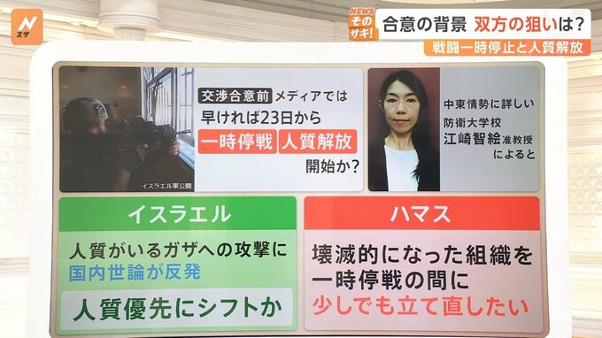 ここにきて一転して、こういった交渉に至った背景・タイミングについてです。交渉合意前、メディアでは「早ければ23日から一時停戦、人質解放を開始か?」ということで、かなり早い段階で話が進んでいるということがうかがえます。