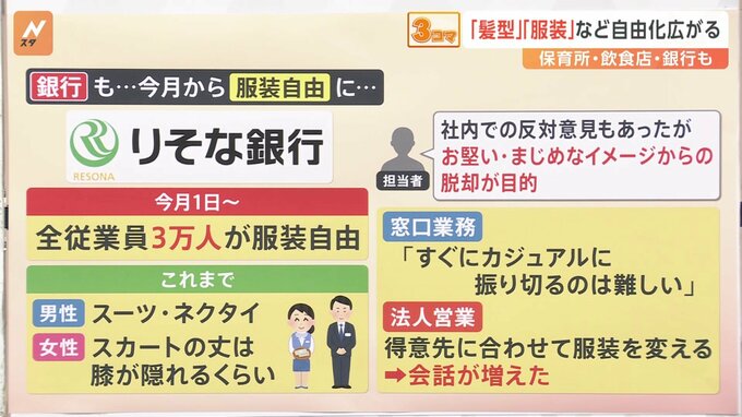 服装自由化してから約20日経って社内の反応は、窓口業務は「すぐにカジュアルに振り切るのは難しい」。法人営業は「得意先に合わせて服装を変えることで会話が増えた」というような声が、社内から出ているそうです。