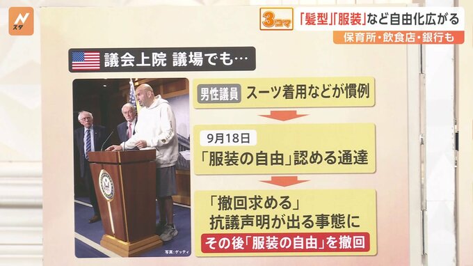 そして、アメリカの議会上院の議場では、ある男性議員が「スーツの着用などが慣例化されてるのはおかしいのではないか」というふうに訴えました。9月18日には「服装の自由」を認める通達もありました。ただ、撤回を求める抗議声明が出る事態に。その後、「服装の自由」が撤回で、スーツ着用が「ルールとして」決まったというわけなんですね。やっぱり国のトップの人たちには、礼儀が必要だということで、その礼儀には服装なども大事になってくるというふうに言っていました。