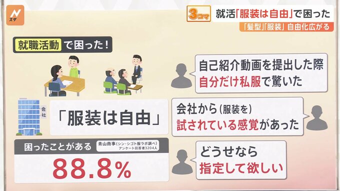 就職活動に関しても、面接で「服装は自由ですよ」と言われても困るよなっていう声が、88.8%と9割近くある。就活生からは「自己紹介動画を提出した際、自分だけ私服で驚いた」「会社から(服装を)試されている感覚があった」「どうせなら指定してほしい」という様々な声がありました。