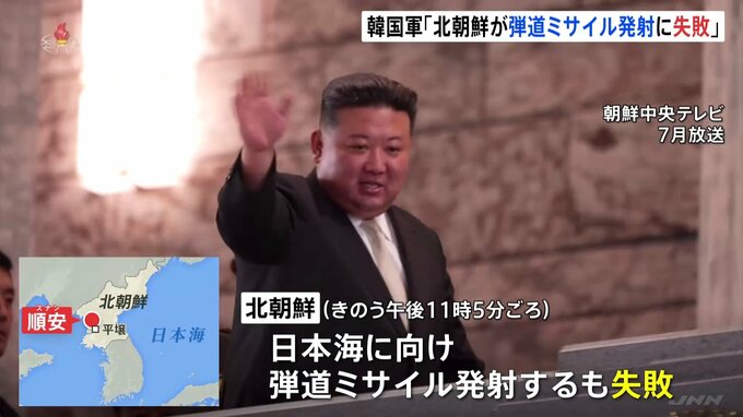 韓国軍は北朝鮮がきのう夜に日本海に向けて弾道ミサイルを発射したものの、失敗したとみられると発表しました。韓国軍の合同参謀本部は、北朝鮮がきのう午後11時5分ごろ、首都平壌近郊の順安付近から日本海に向け…