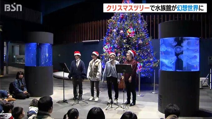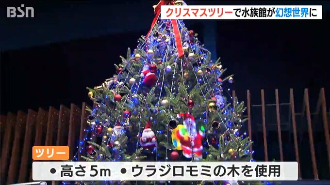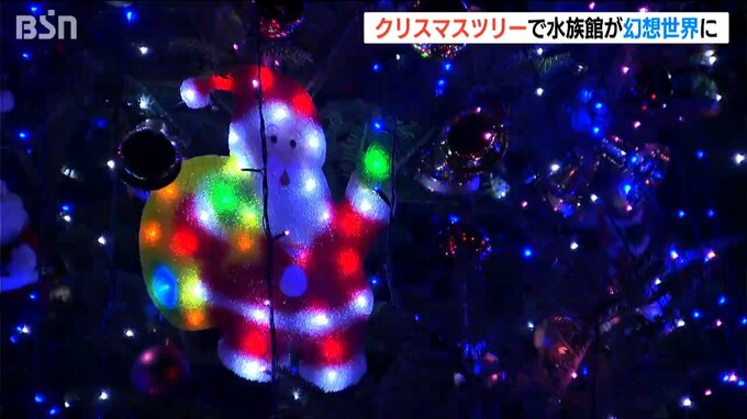 新潟市の水族館では恒例のクリスマスツリーがお披露目され、海の世界とイルミネーションが織りなす幻想的な世界が広がっています。