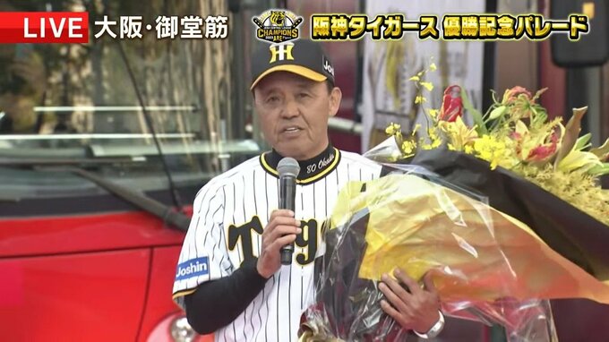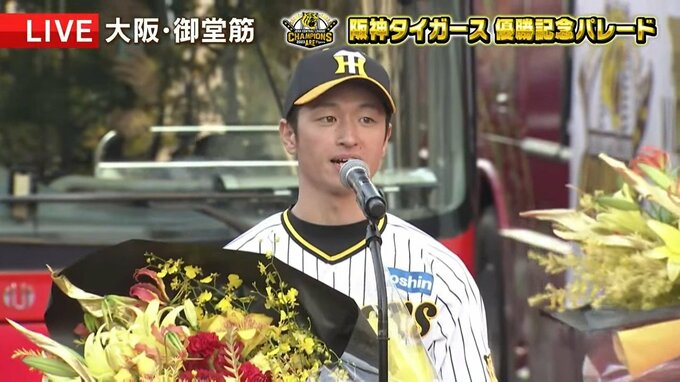 「ファンの皆様、1年間ご声援ありがとうございました。タイガースはおかげさまで18年ぶりのリーグ優勝、38年ぶりの日本一を勝ち取ることができました。きょうなんでここからスタートするのかなと考えていましたが、この右側は6年間通った小学校、いまは「オドナ」ですが、ここで小学生生活を過ごした地なので、今回こういう形でここからスタートできることは光栄に思うし感無量の気持ち。「アレ」を達成して、「アレのアレ」ってのは、誰が言ったかわからないけど・・・。最高の形で1年を締めくくることができたのできょうは選手全員でお礼の気持ちでパレードしたいと思うので最後の大声援をよろしくお願いいたします」