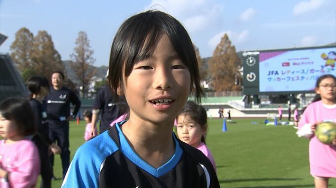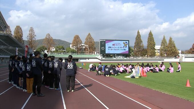 子どもから大人まで幅広い年代の女性がサッカー・なでしこリーグの選手たちとプレーを楽しむ「レディースガールズサッカーフェスティバル」が岡山市北区で開かれました。