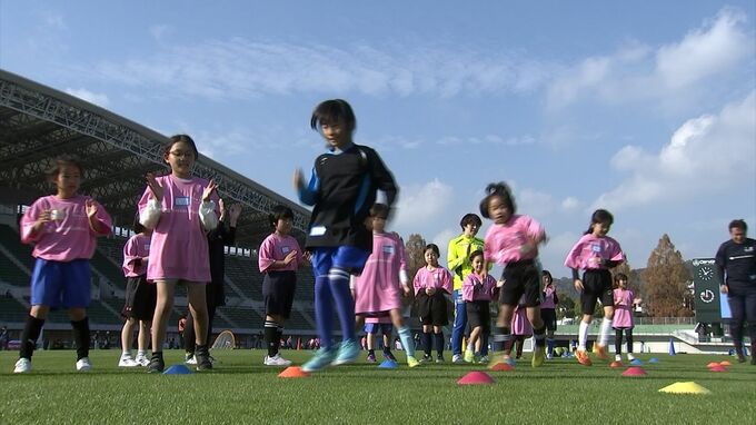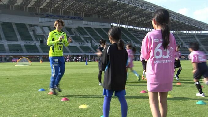 会場では「岡山湯郷ベル」と「吉備国際大学シャルム岡山高梁」に所属する選手らが講師を務め、参加者は芝生の上を走りながら選手たちと一緒にプレーを楽しみました。