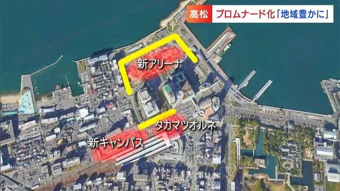 高松駅周辺では車道を減らし歩道を広げたらどうなるか検討しようと社会実験を行っています。周辺では徳島文理大学の新キャンパスや1万人規模のアリーナ建設が進みます。これらを利用する人が中心市街地の商店街との間を歩いて移動すれば活性化が進むという訳です。
